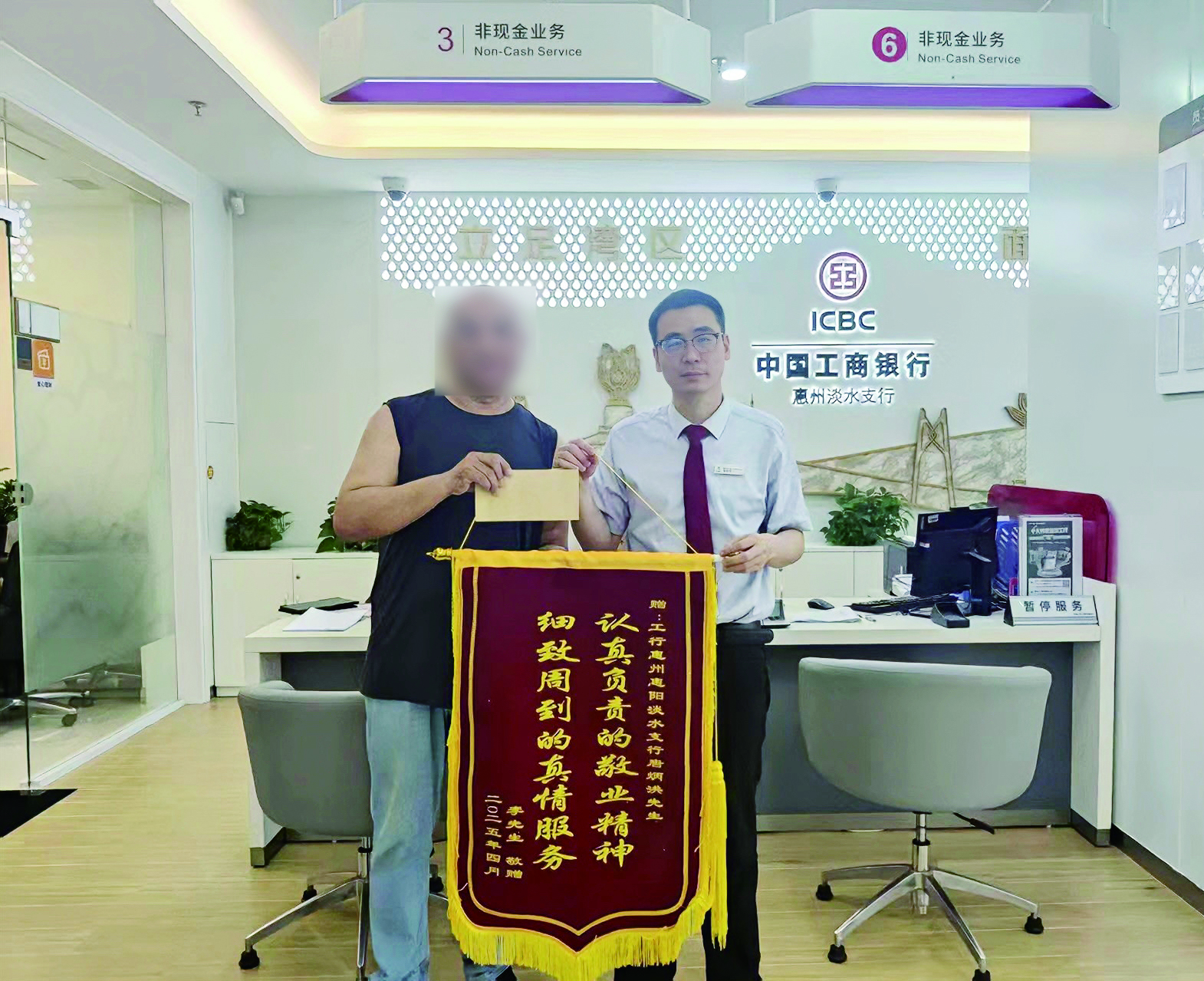 李先生給唐炳洪送上感謝信和錦旗。 工商銀行惠州分行供圖
