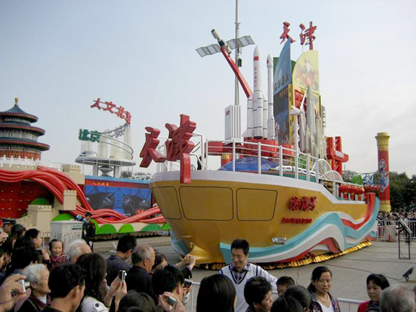 國慶彩車制造完成后起運的熱烈場面