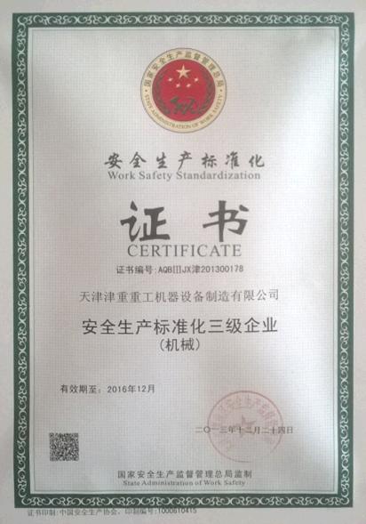 2013年12月我公司被天津市津南區(qū)安全生產(chǎn)管理局認定為安全生產(chǎn)標準化三級企業(yè)(機械)并頒發(fā)證書。