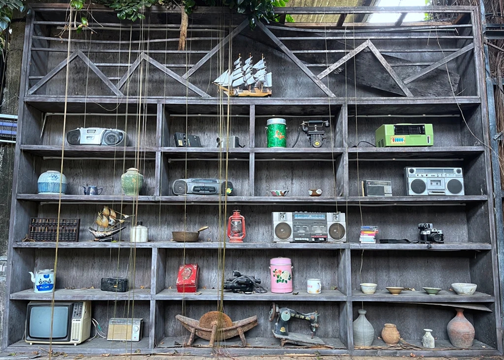 “潛珍閣”利用老船廠遺留的柱、梁、建筑基礎(chǔ)打造成新的公共空間,輪機(jī)車間成為了品茗交流之處,鑄造車間變成了工藝品展覽室——鍋碗瓢盆、桌椅板凳床、琴棋書畫、炊具農(nóng)具,各式小家電,還有花轎、食格、盒籮等惠州民間舊式婚嫁習(xí)俗物品等,各種各樣的老物件,看似雜亂堆疊實則頗有心思組合,令人目不暇接。市民游客穿行其中,每個人都能在這里找到有關(guān)童年、成長的打開方式。這里經(jīng)常有收藏“發(fā)燒友”來交流,也吸引了不少文化人士來參觀。