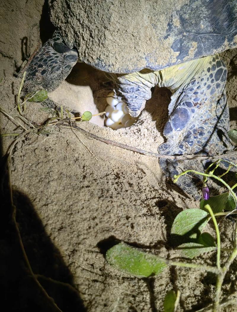 當(dāng)天凌晨,母海龜從海里悄悄爬上沙灘,用健壯的四肢在沙灘上挖了個(gè)坑,趴著產(chǎn)下一窩龜?shù)昂笥峙老蚝@,?時(shí)30分消失在浪潮里。