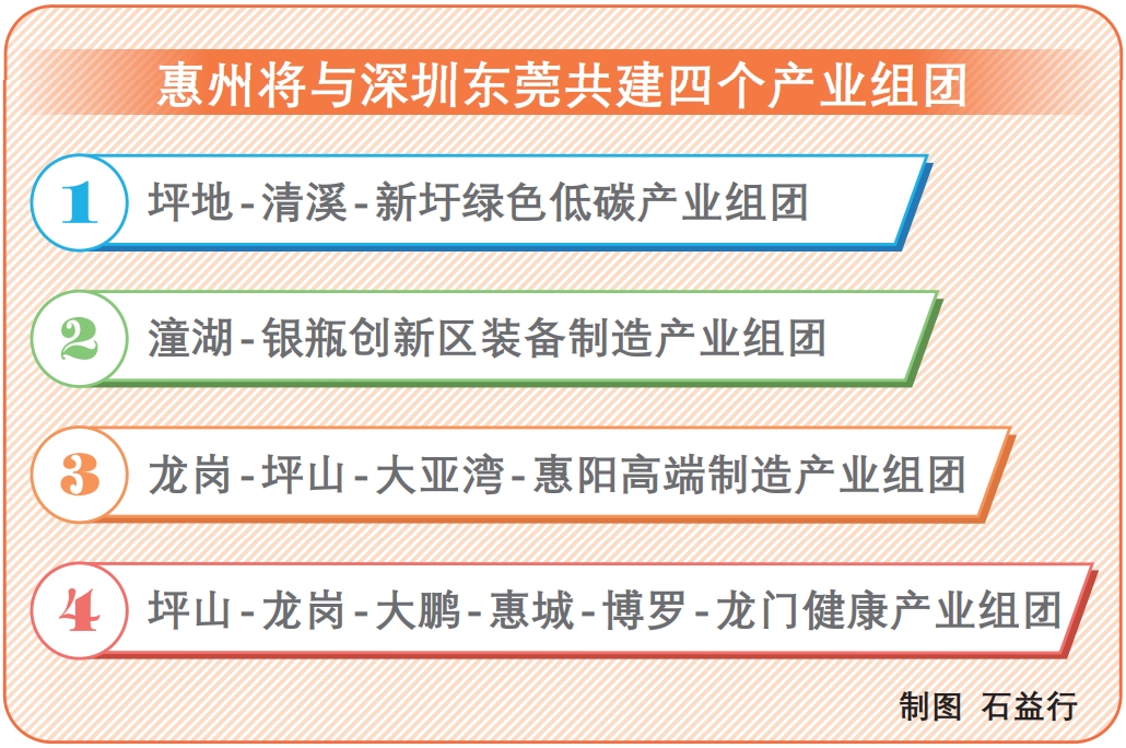 《深圳都市圈發(fā)展規(guī)劃》提出,要高質(zhì)量建設(shè)跨區(qū)域產(chǎn)業(yè)組團(tuán)。對(duì)此,《方案》還明確惠州將與深圳、東莞共建四個(gè)組團(tuán),分別為坪地-清溪-新圩綠色低碳產(chǎn)業(yè)組團(tuán)、潼湖-銀瓶創(chuàng)新區(qū)裝備制造產(chǎn)業(yè)組團(tuán)、龍崗-坪山-大亞灣-惠陽(yáng)高端制造產(chǎn)業(yè)組團(tuán)、坪山-龍崗-大鵬-惠城-博羅-龍門(mén)健康產(chǎn)業(yè)組團(tuán),并提出了具體建設(shè)目標(biāo)。