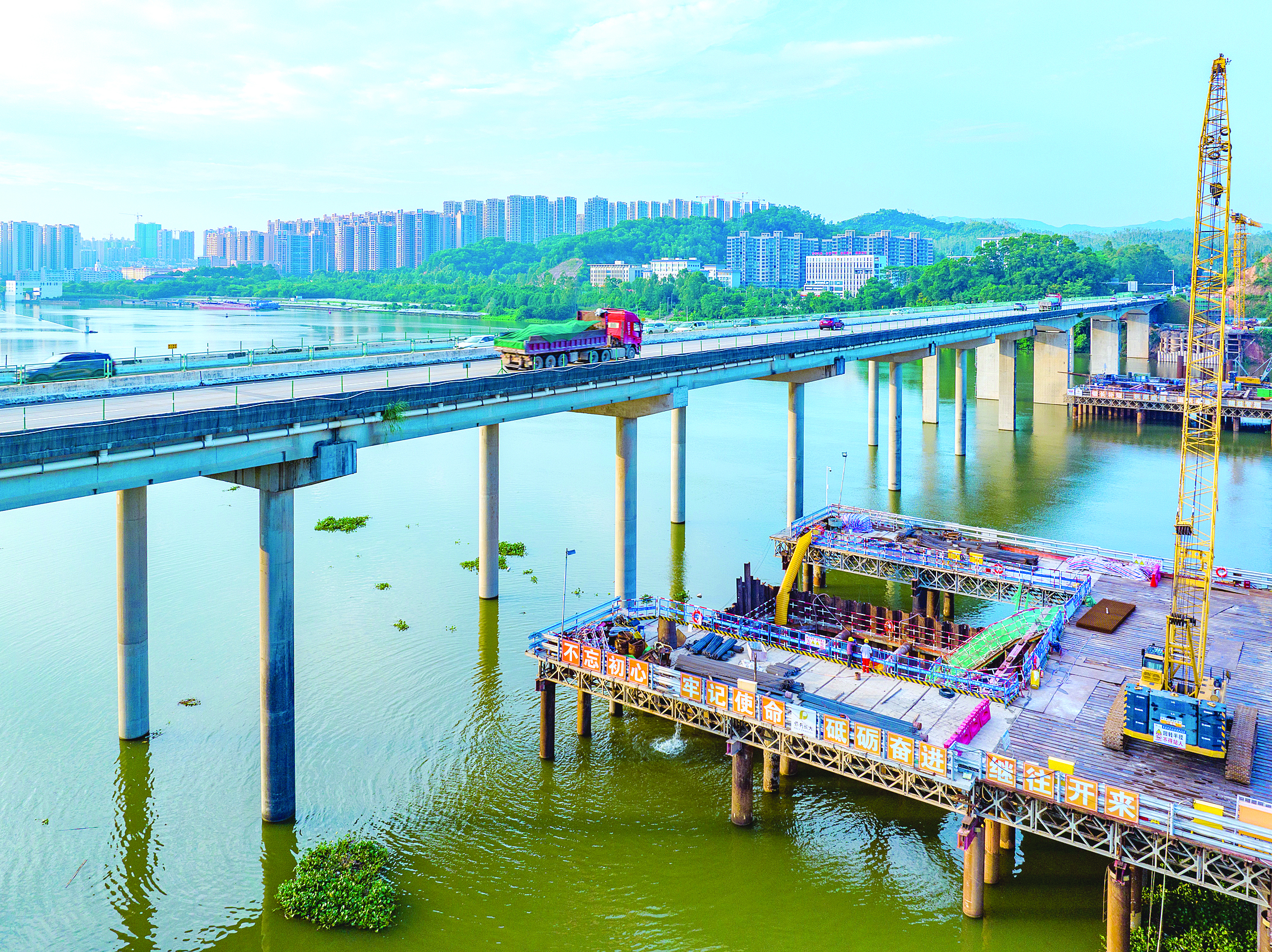 惠河高速改擴(kuò)建東江特大橋開(kāi)啟水中墩身施工。 惠州日?qǐng)?bào)記者戴建 通訊員劉志浩 攝