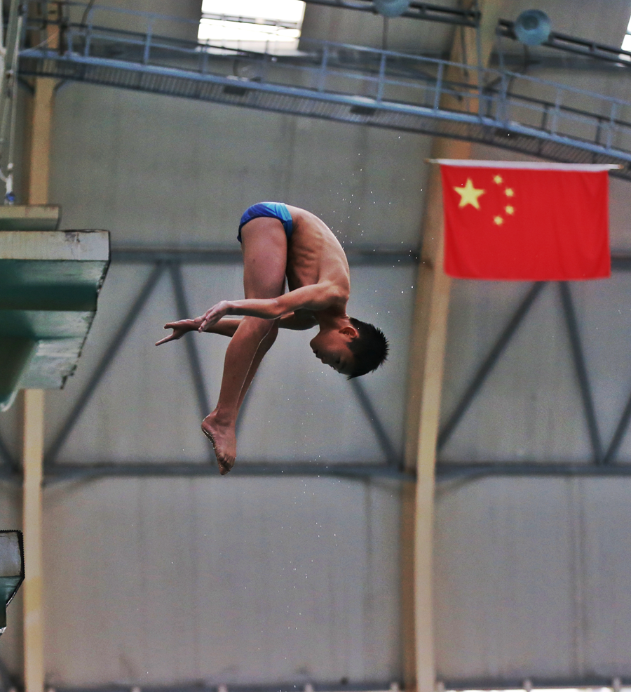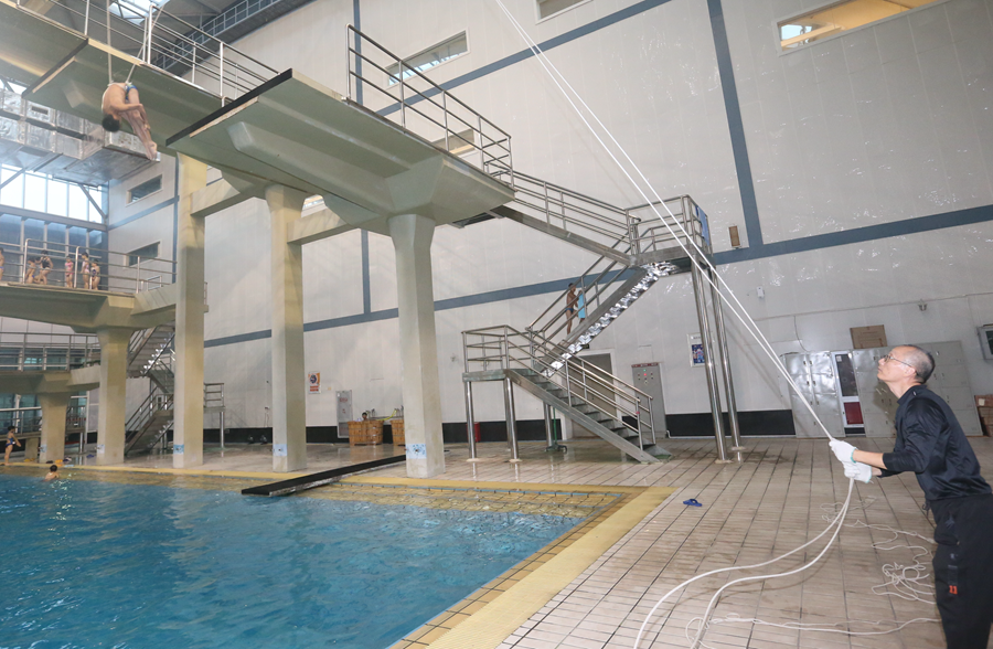 運(yùn)動(dòng)員在6米臺(tái)進(jìn)行前空翻二圈半屈體動(dòng)作訓(xùn)練。