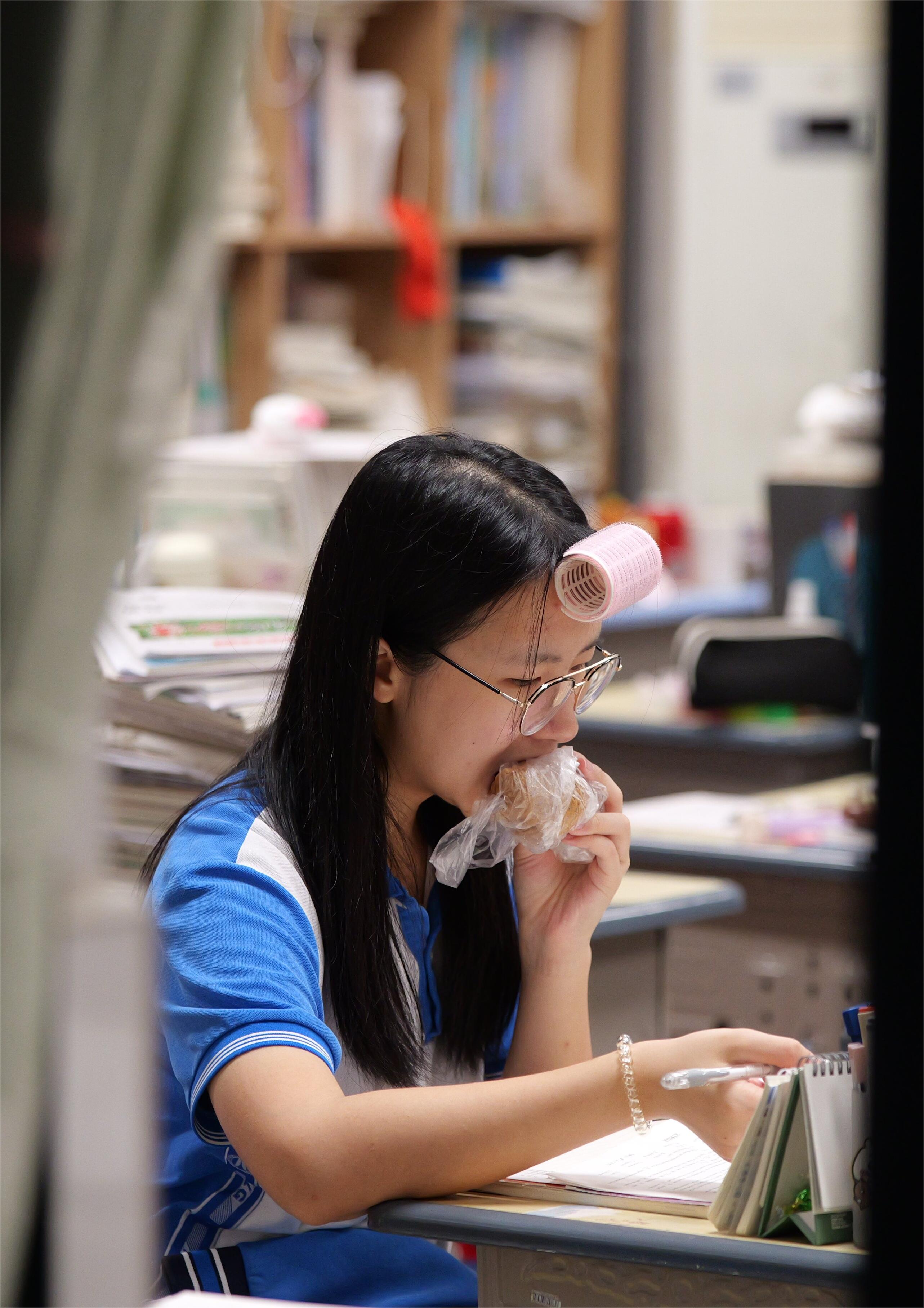 高三(19班)葉雅今告訴記者:”為了有更多的學(xué)習(xí)時(shí)間,許多同學(xué)跟我一樣,在飯?zhí)么虬埐藖?lái)課室邊吃邊學(xué)習(xí)!