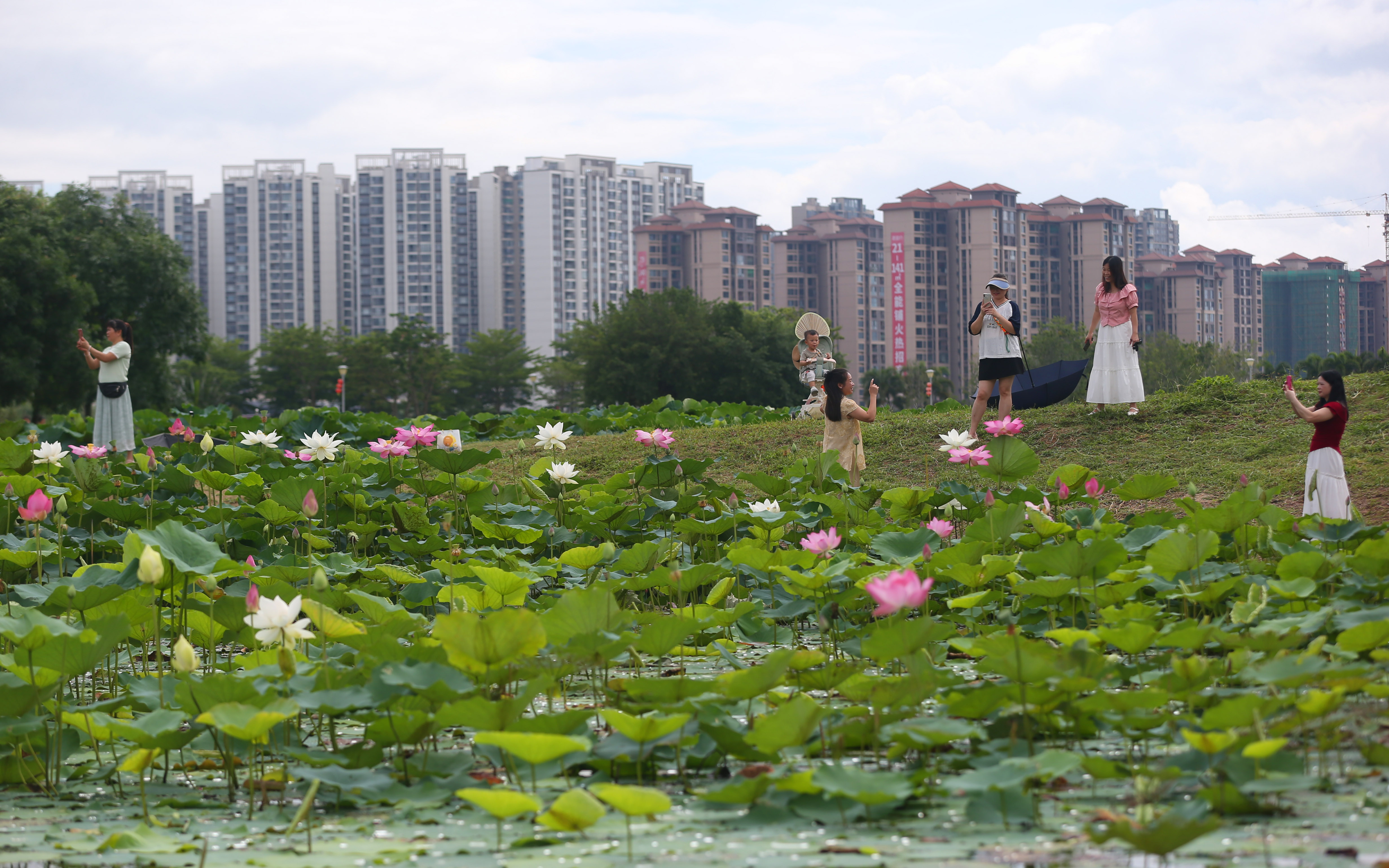 大湖溪瀝濕地公園荷花盛開,吸引市民前來打卡賞花。