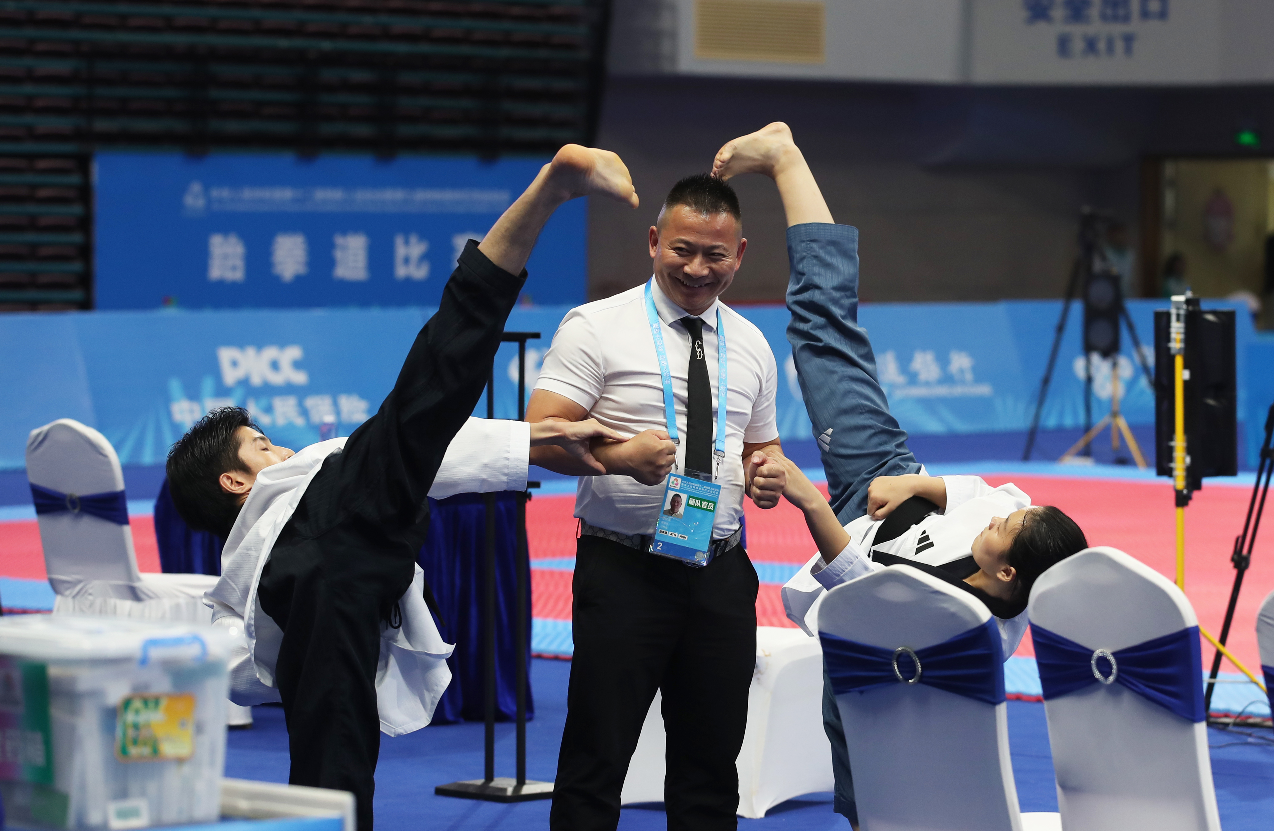 比賽間隙,教練幫助運動員拉伸。