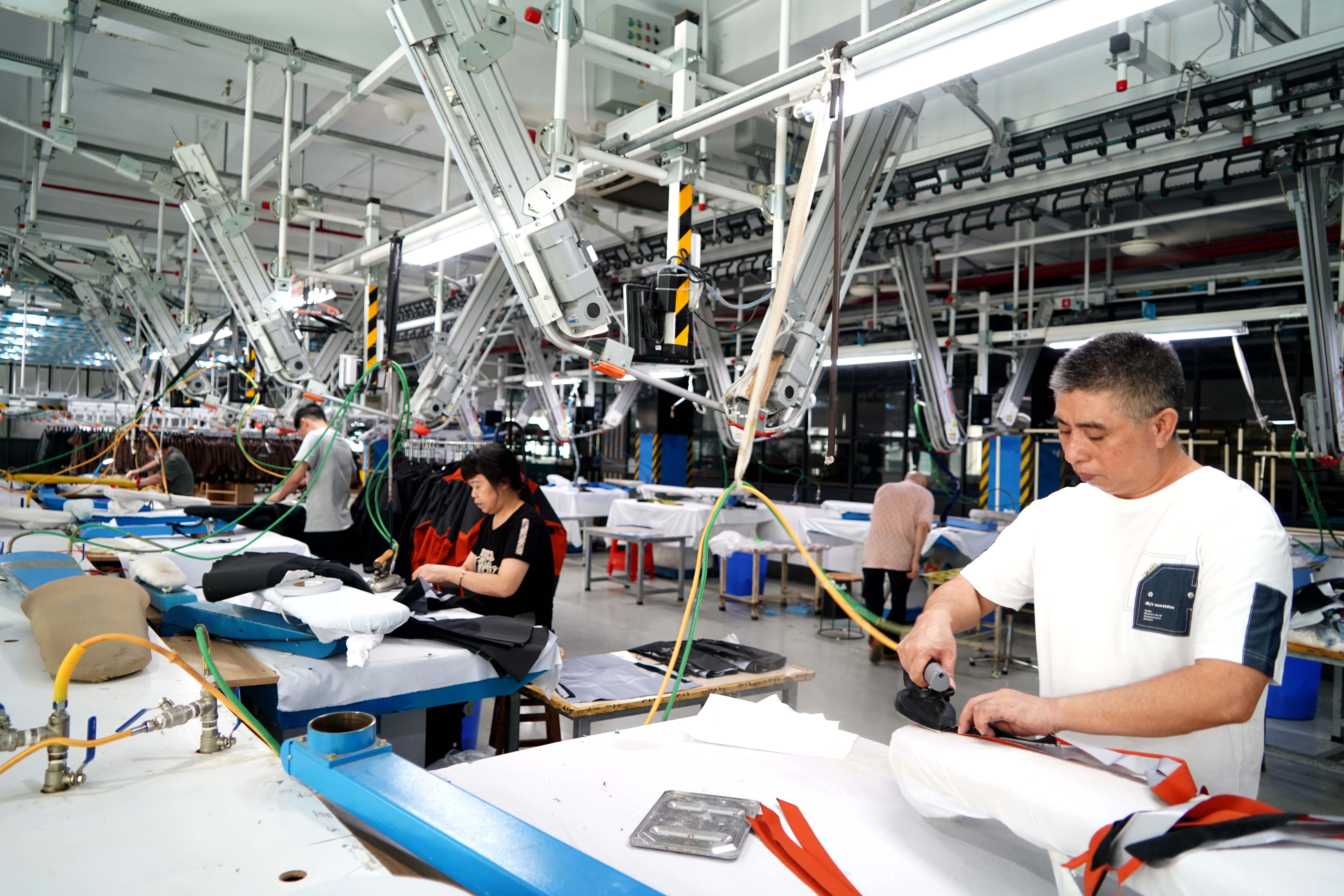 佳都(惠州)制衣有限公司熨燙車間,工人們正在熨燙某運動品牌服裝配件。