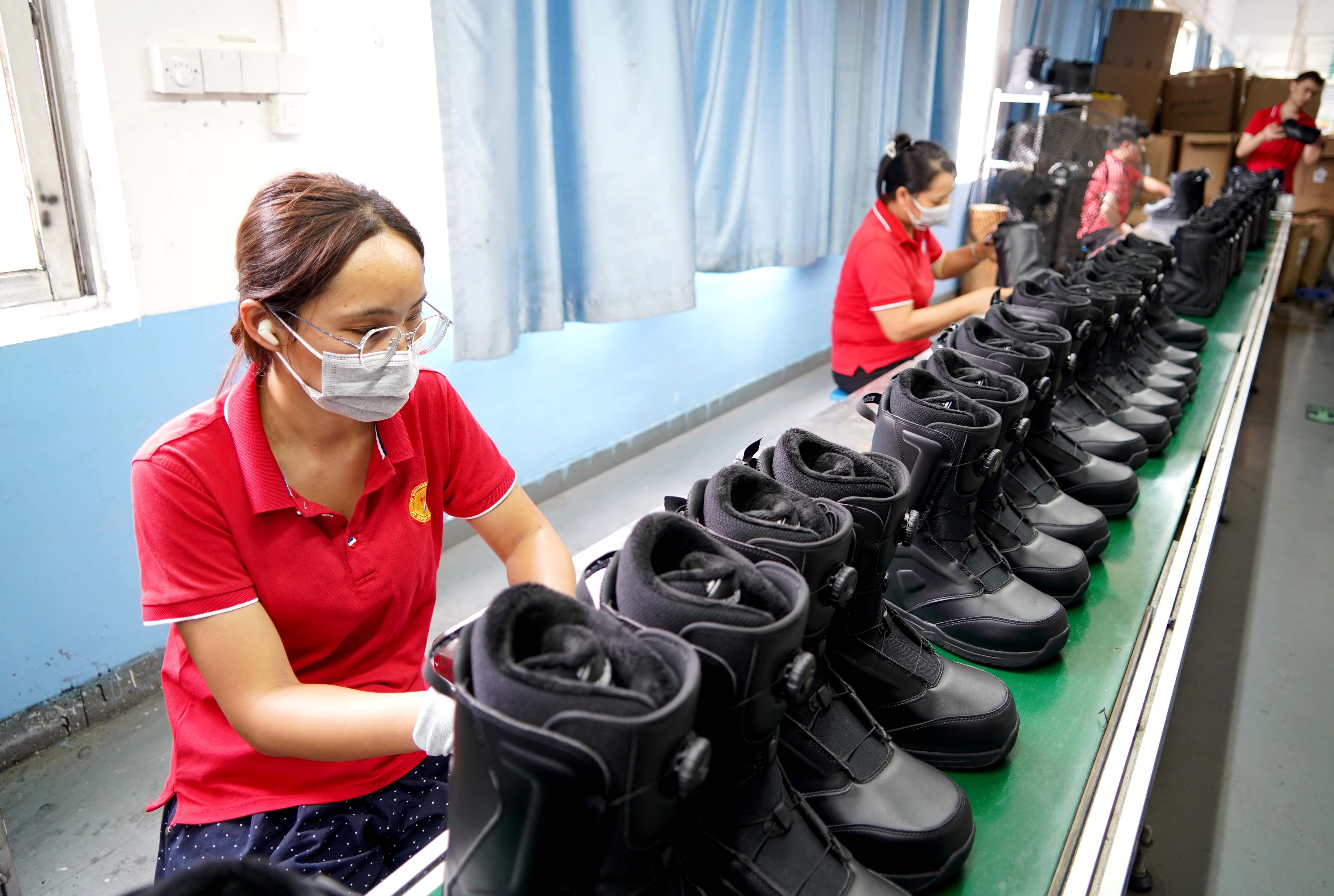 廣東鼎弘欣運動科技有限公司滑雪靴質檢車間,工人在認真檢查每一雙鞋的質量。
