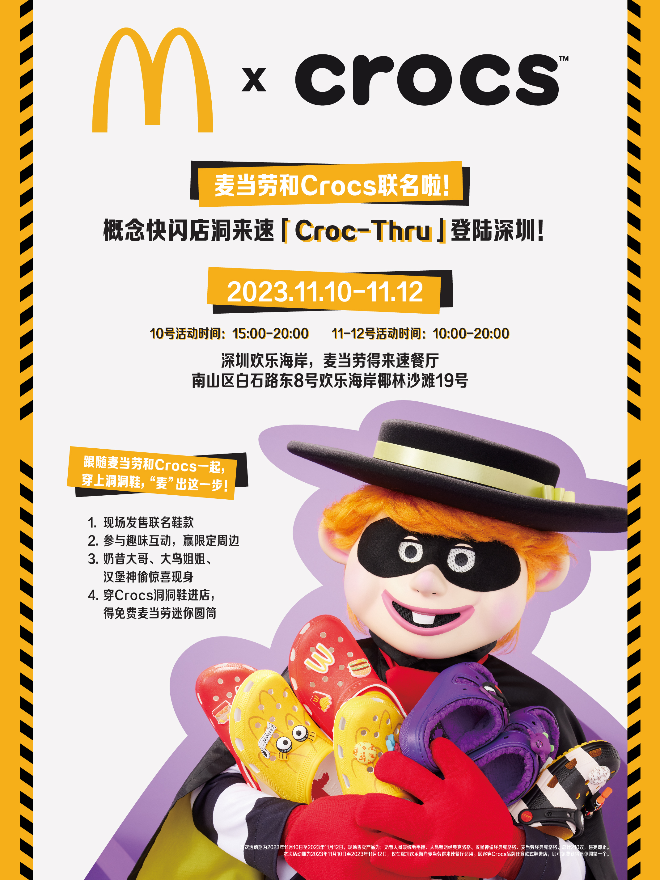 除聯(lián)名系列產(chǎn)品外,麥當(dāng)勞中國還將聯(lián)手Crocs首發(fā) “洞來速” 潮流快閃活動,開啟限時趣味體驗。Croc-Thru(洞來速)靈感來源于麥當(dāng)勞Drive-Thru(得來速餐廳),消費者可以步入模擬得來速購餐窗口的線下快閃店,購買麥當(dāng)勞x Crocs聯(lián)名產(chǎn)品。這一全新概念的快閃店將于11月10日15點至11月12日20點,登陸深圳歡樂海岸麥當(dāng)勞得來速餐廳。深圳 “洞來速” 快閃店將在現(xiàn)場發(fā)售部分聯(lián)名鞋款,此外,消費者還有機會與奶昔大哥、大鳥姐姐及漢堡神偷互動,并贏取限定禮品。