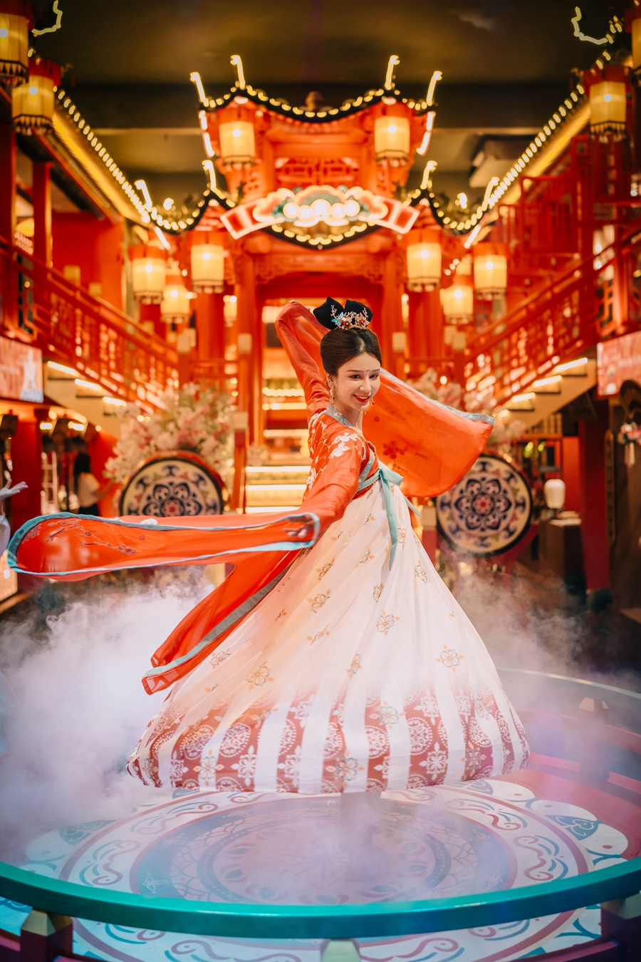 游客置身城中,切身感受到唐朝的風(fēng)土人情:從身邊走過的盛唐“名人”、整齊排列的大唐市集、隨著古風(fēng)音樂翩然起舞的驚鴻麗影……游客還可以在市集內(nèi)購買唐風(fēng)物件的仿古“大唐寶鈔”,可選擇參加“變裝秀”,仿佛開啟了一趟穿越之旅,恍惚與李白對(duì)酒當(dāng)歌,與貴妃同醉,與唐朝人搭話閑聊,不時(shí)有挑著扁擔(dān)的唐朝小販吆喝著從身邊走過。精心打造的場(chǎng)景讓游客身處大型情景劇,每一位游客都是穿梭其中的主角,擁有著更加豐富、深刻的用餐感受,同時(shí)也體驗(yàn)到唐朝文化的魅力和旅游的樂趣。