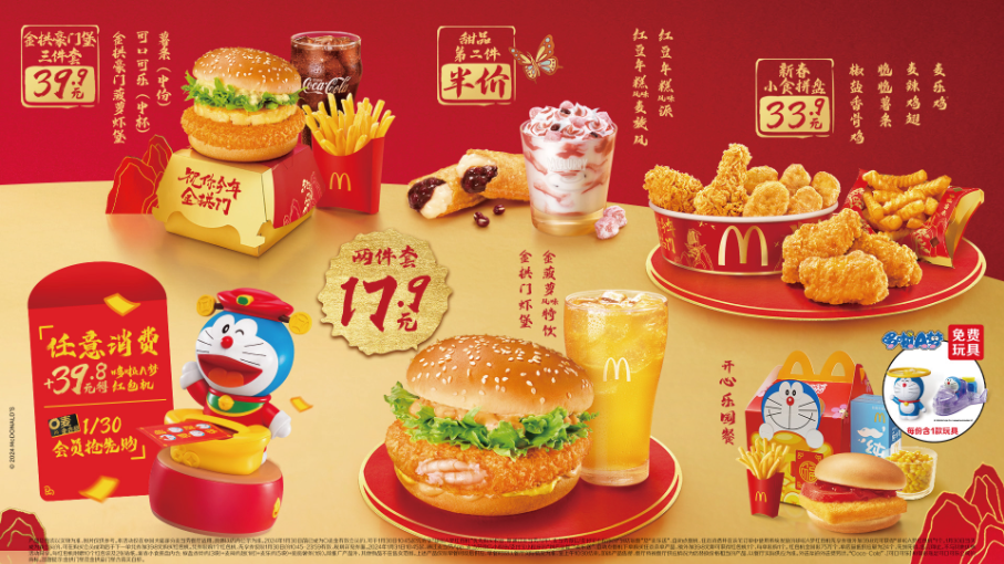 消費(fèi)者可在麥當(dāng)勞餐廳品嘗到包括金拱門堡、椒鹽香骨雞、菠蘿特飲在內(nèi)的12款新春限定美味。此外,麥當(dāng)勞中國(guó)還推出哆啦A夢(mèng)主題的系列周邊