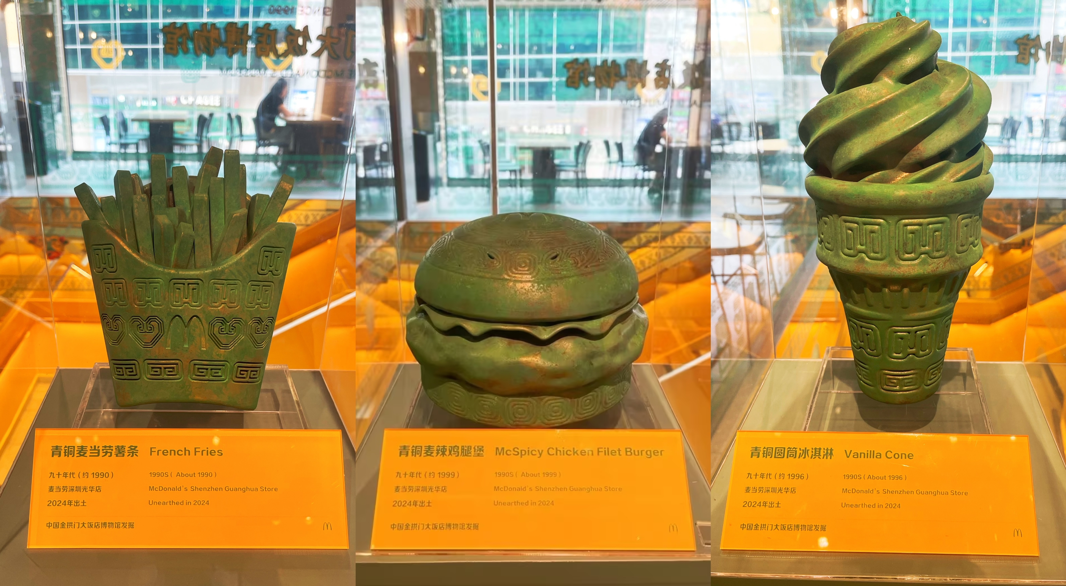 現(xiàn)場(chǎng)可看到薯?xiàng)l、漢堡、圓筒冰淇淋的“青銅器”展示