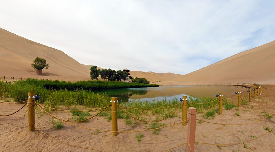 沙漠奇觀(guān)鳴沙山,因沙動(dòng)成響而得名。天下沙漠第一泉——月牙泉,處于鳴沙山環(huán)抱之中,其形酷似一彎新月而得名。鳴沙山,月牙泉,夢(mèng)一般的謎,千百年來(lái)不為流沙而淹沒(méi),不因干旱而枯竭。古往今來(lái)以“山泉共處,沙水共生”的奇妙景觀(guān)著稱(chēng)于世,被譽(yù)為塞外風(fēng)光之一絕。在這里,可以赤足爬山、在沙漠中騎駱駝或是滑沙。