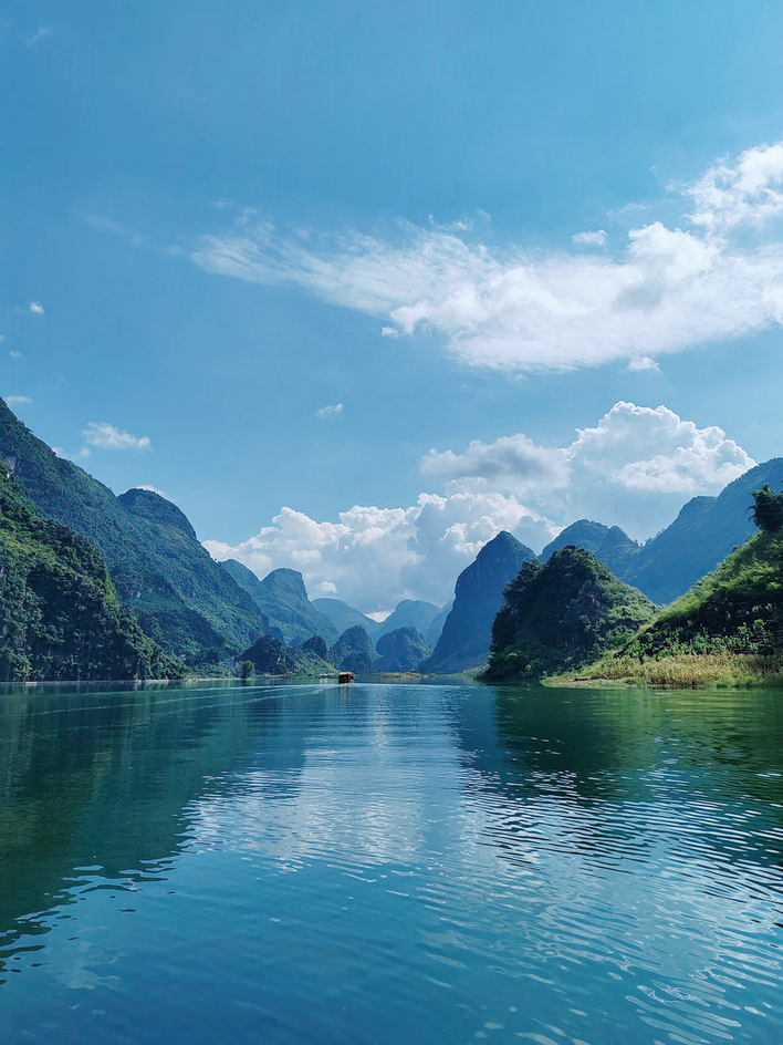 在德天瀑布景區(qū)最高處,俯瞰方圓十幾里的邊境內(nèi)外景色,歸春河兩岸寧?kù)o美好,邊民安居樂(lè)業(yè),好一幅田園風(fēng)光大作。遠(yuǎn)眺連綿起伏的群山,重巒疊嶂,美不勝收。