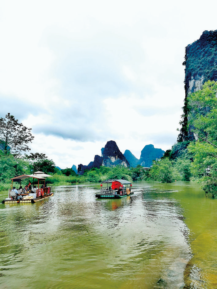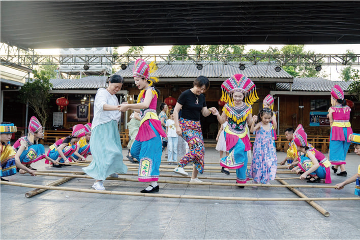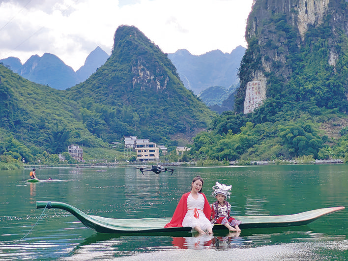 當(dāng)天黃昏時(shí)分進(jìn)入明仕田園農(nóng)莊,在竹排上聽(tīng)壯族阿妹唱山歌,歌聲悠悠揚(yáng)揚(yáng),感受壯鄉(xiāng)山歌獨(dú)有的情趣。