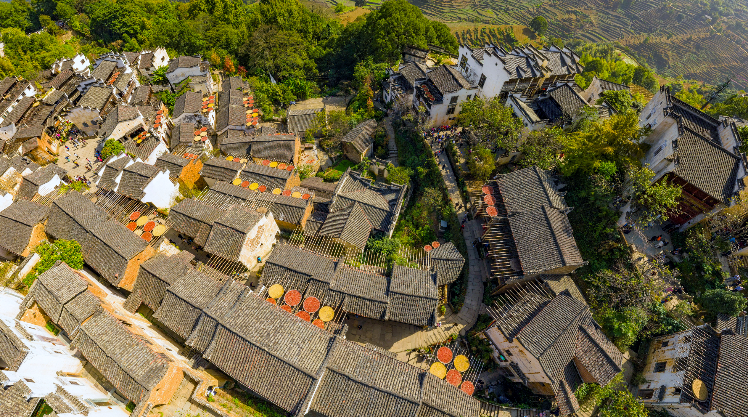 婺源縣篁嶺景區(qū)漫山紅楓葉與曬秋盛景交織。