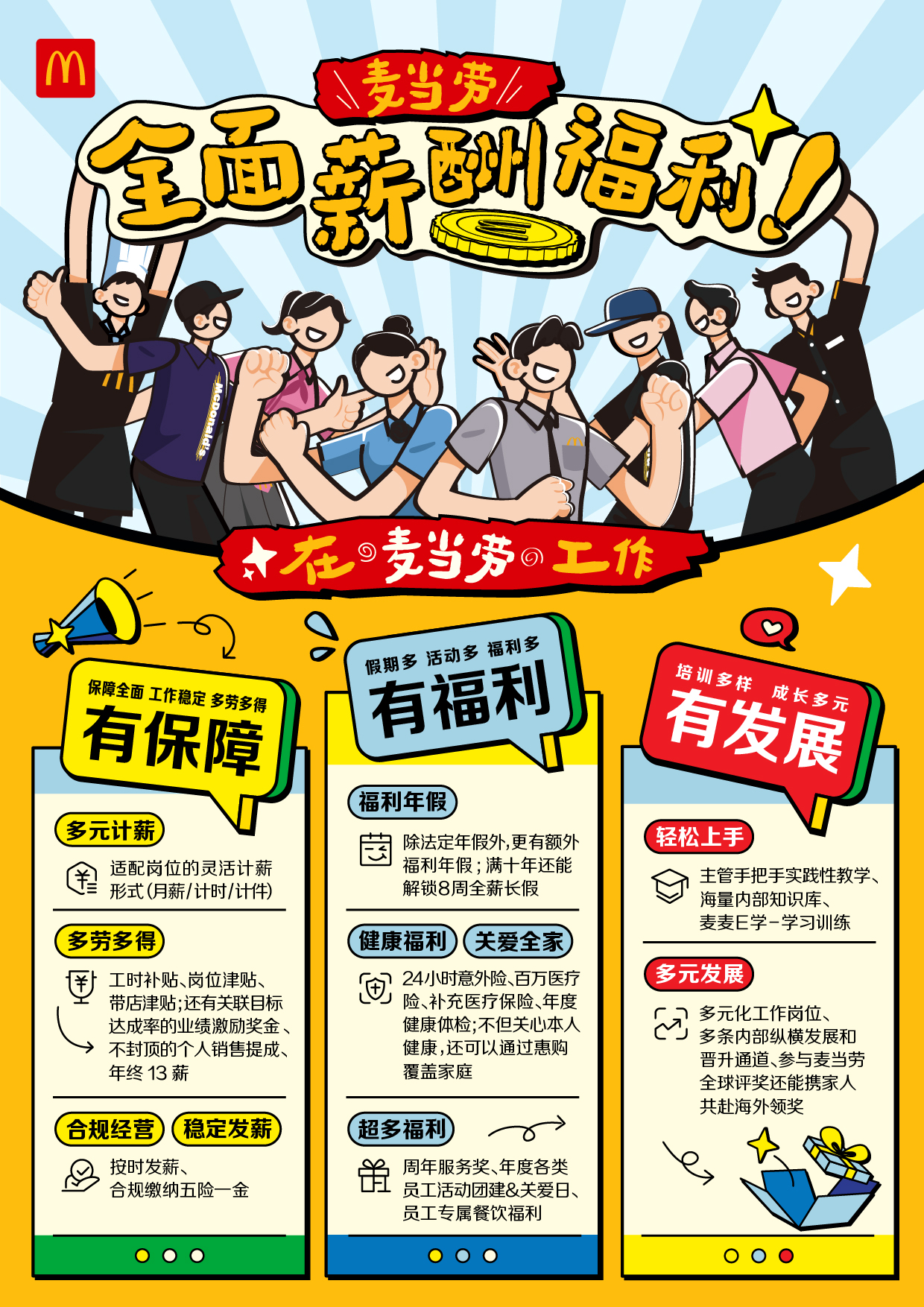 有保障:多元計(jì)薪、工作穩(wěn)定、多勞多得,薪酬有保障。麥當(dāng)勞為餐廳不同崗位定制了不同的薪酬體系,提供包括月薪、計(jì)時(shí)、計(jì)件等多元化計(jì)薪方式,疊加工時(shí)補(bǔ)貼、崗位津貼、帶店津貼等多重激勵(lì),還設(shè)置了業(yè)績(jī)獎(jiǎng)金、無(wú)上限的銷售提成和年終13薪,為員工全額繳納五險(xiǎn)一金。