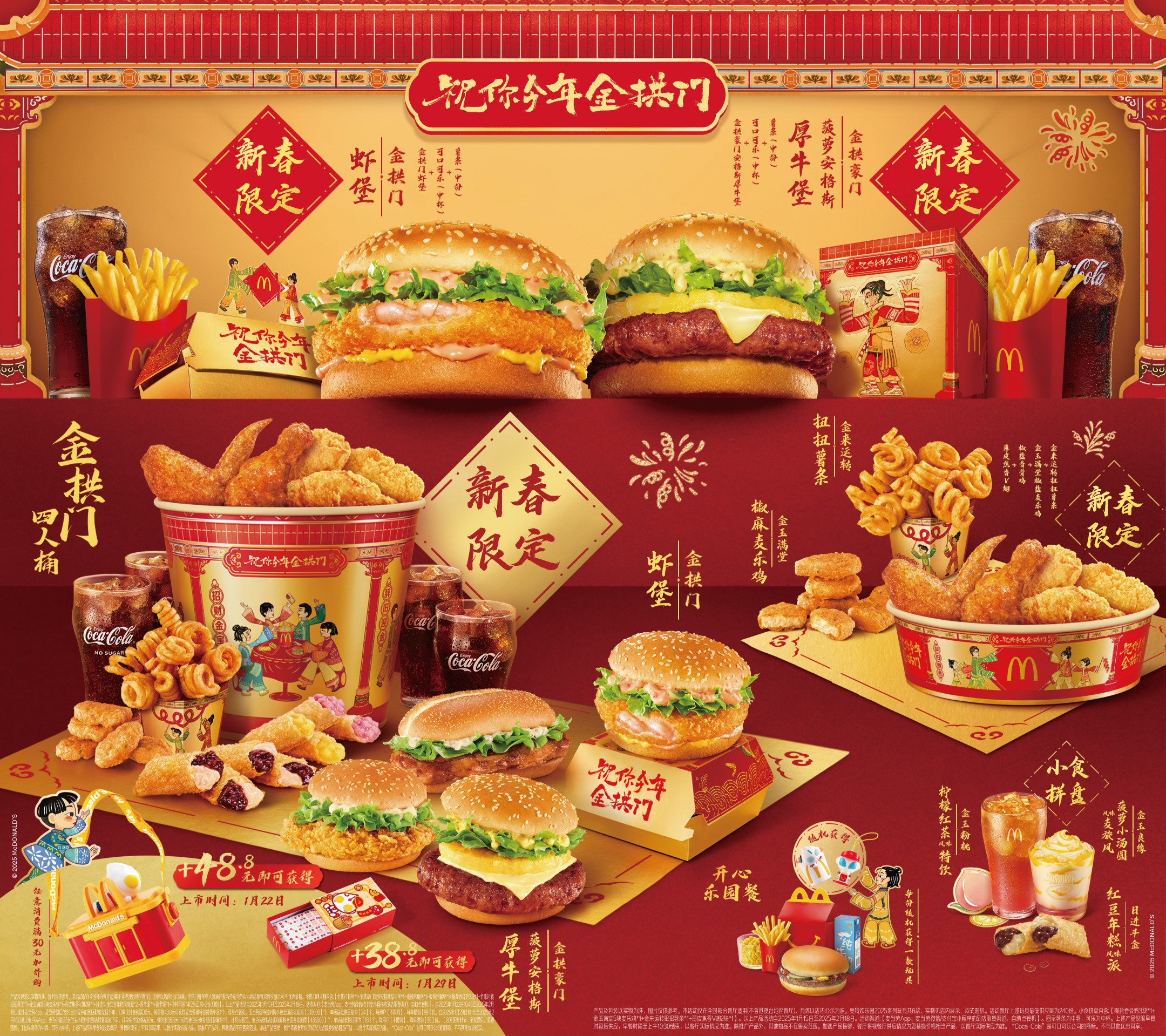 1月15日至2月18日,消費者可在麥當勞餐廳品嘗到金拱門蝦堡、金玉滿堂椒麻麥樂雞、金來運轉扭扭薯條、日進斗金紅豆年糕風味派和金玉粉桃檸檬紅茶風味特飲等9款新春限定美味