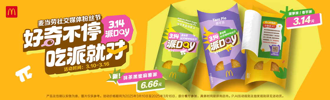2025年3月7日,麥當(dāng)勞中國宣布,年度社交媒體粉絲節(jié)“派DAY”將于3月10日至16日正式開啟。第十一屆派Day以“好奇不停,吃派就對”為主題,呼應(yīng)3月14日國際圓周率日,致敬對未知持續(xù)探索的好奇心;顒悠陂g,麥當(dāng)勞經(jīng)典香芋派、菠蘿派及全新“抹茶黑蜜麻薯派”優(yōu)惠價低至3.14元。麥當(dāng)勞中國還首次推出對話式AI互動“P.AI”——消費者可通過麥當(dāng)勞官方App參與AI對話互動,瓜分超90000元現(xiàn)金大獎。