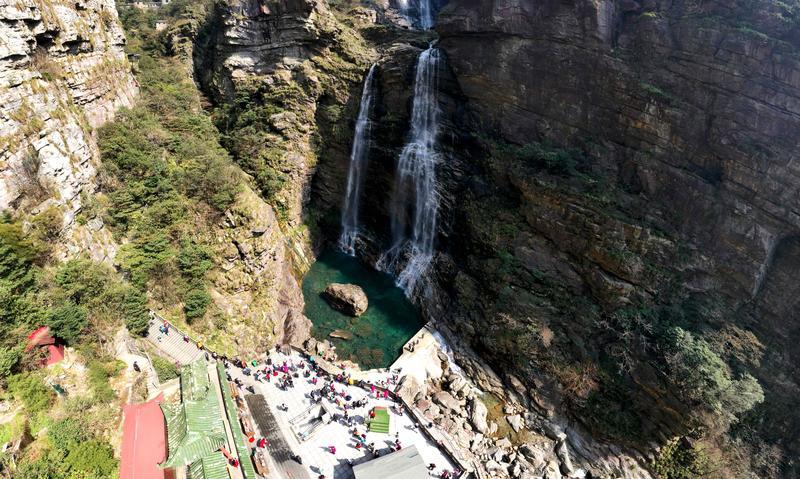 “飛珠散輕霞,流沫沸穹石”,三疊泉在五月將迎來豐水季。155米的三級瀑布如白練垂空,沿陡峭石階下行時,飛濺的水霧會為每位到訪者送上天然的清涼SPA。