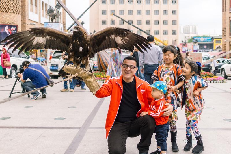 在新疆的大巴扎與鷹歡樂互動。