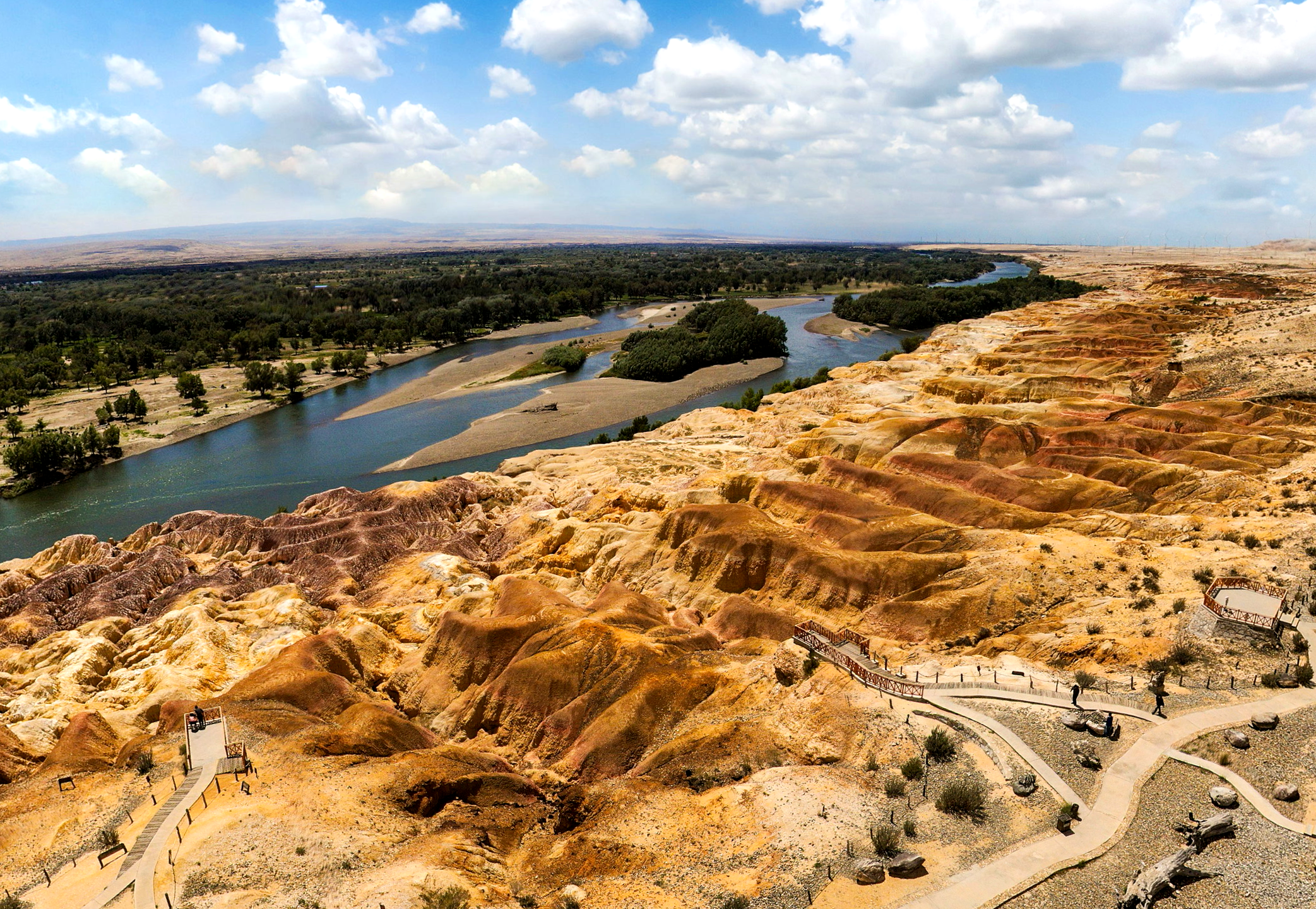 額爾齊斯河畔的雅丹奇跡。一河隔開,南岸是郁郁蔥蔥的河谷胡楊林,北岸則是色彩絢麗的懸崖式雅丹地貌。尤其在日落時(shí)分,夕陽的余暉為這些由紫紅、土紅、淺黃、淺綠等泥巖、砂巖構(gòu)成的石丘披上最華美的外衣,光影流轉(zhuǎn),色彩斑斕,宛如上帝打翻的顏料盤,流淌在壯闊的天地之間。