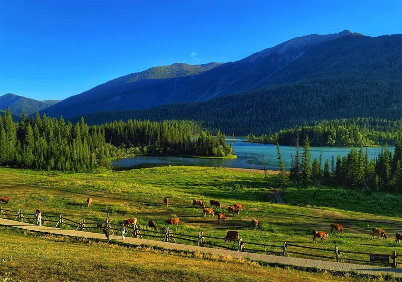 天山懷抱中的高山冷水湖。湖水清澈見底,透明度極高,在陽光照耀下呈現(xiàn)出令人心醉的藍(lán)。湖畔是遼闊的高山草甸,夏季野花如繁星點(diǎn)綴,秋季牧草金黃。遠(yuǎn)處雪山連綿,倒映在如鏡的湖面上,牛羊悠然漫步,構(gòu)成一幅寧靜致遠(yuǎn)的絕美畫卷,“凈!敝,名副其實(shí)。