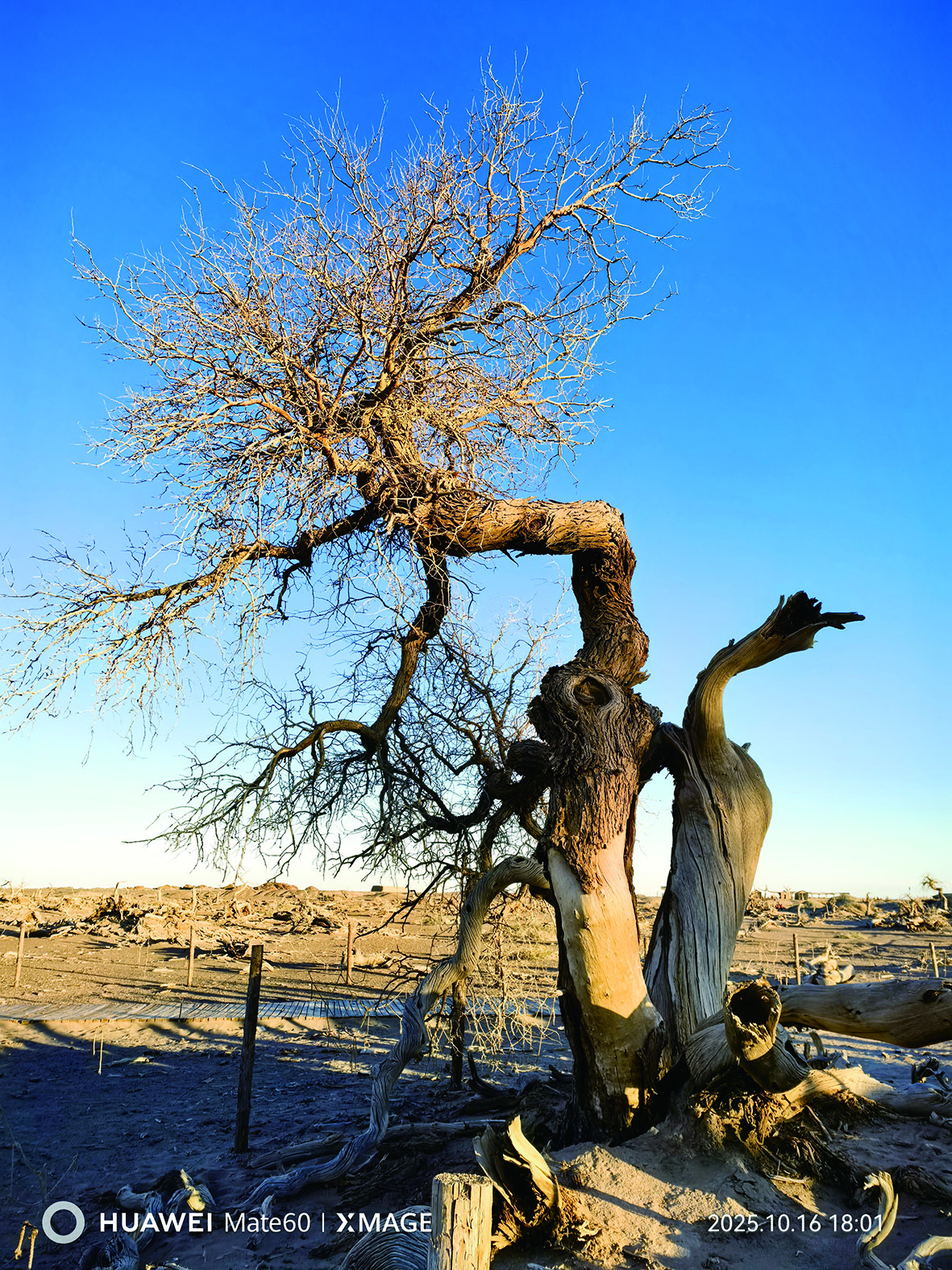 按照行程安排,他們先探訪了額濟(jì)納旗八道橋胡楊林景區(qū)!皬囊坏罉虻剿牡罉颍康罉蚓吧疾灰粯!惫鸷突貞,二道橋的水中胡楊林最是秀美,金色的胡楊倒映在黑河中,波光與樹影交織;四道橋被稱為“英雄林”,千年胡楊樹干粗壯、形態(tài)蒼勁。