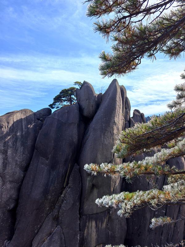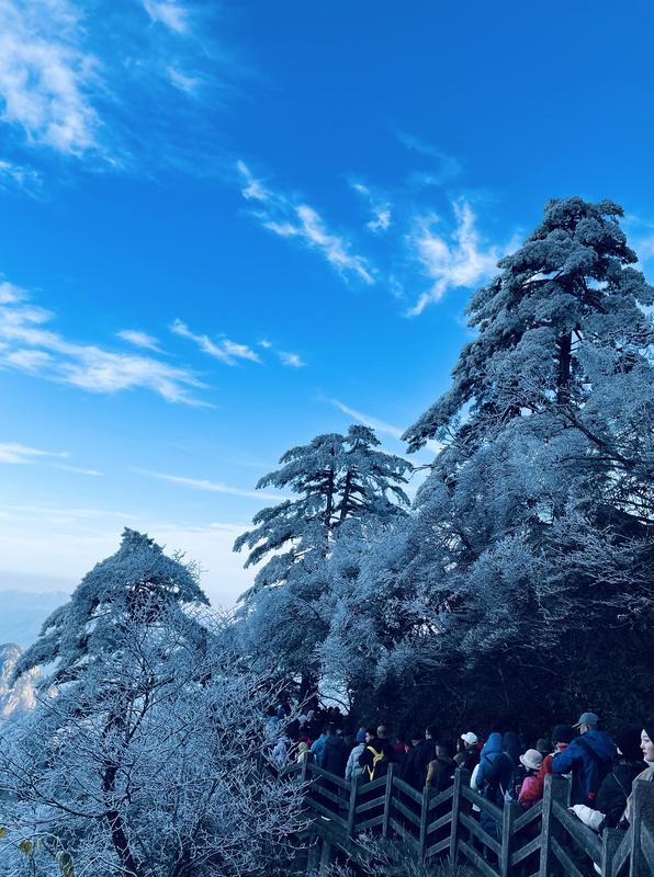 第四天重頭戲:登黃山。大美黃山依然歲月繾綣葳蕤生香,英姿挺拔傲視群雄。昨晚溫度驟降產(chǎn)生的霧凇今朝陽光照耀下熠熠生輝,隊友們個個摩拳擦掌全力以赴。纜車緩緩上升,所見之處皆是突兀的青黑巨石上一大片一大片的不老松,尉為壯觀。包括6位70歲長者在內(nèi)27人全體通過崎嶇陡峭的“好漢坡”,在聞名遐邇的迎客松前留下自己的形象。登上光明頂?shù)?7位勇士有7位60歲以上,他們在布滿冰晶與霧凇的蜿蜒狹窄道路上奮勇前行。隊友們團(tuán)結(jié)互助相互攙扶互相配合,征服奇山險峰挑戰(zhàn)自我,夢想成真不留遺憾……聽,凱旋歸來的笑聲多么爽朗,江山如畫我們亦是豪杰。