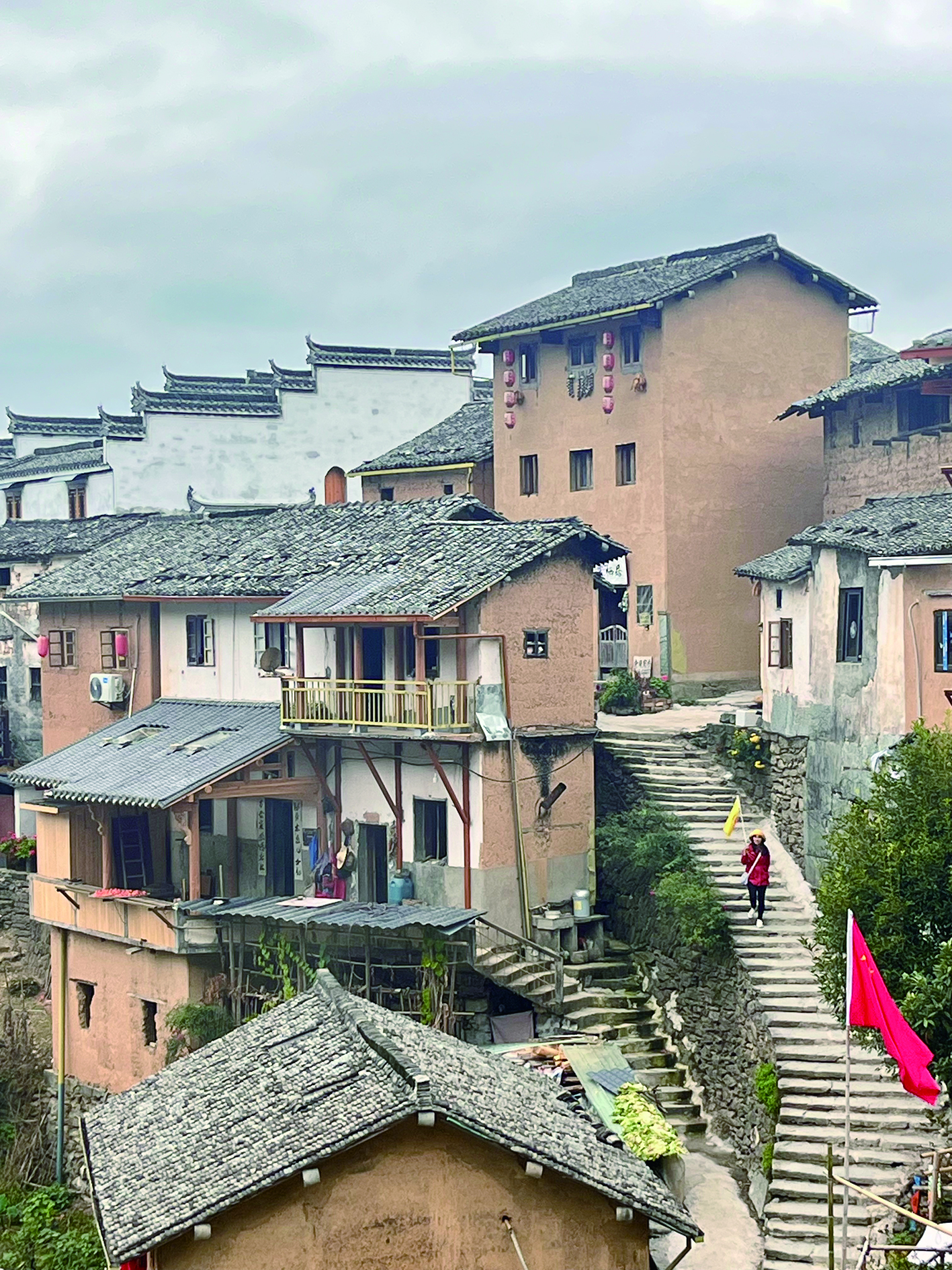 第三天,我們?nèi)チ恕巴钅献詈笠黄瑑敉痢标柈a(chǎn)土樓。土黃色房子依山而建層層堆砌錯落有致,處處掛滿金黃色玉米和紅辣椒,一派古老恬靜的風(fēng)格,與世隔絕不爭光陰。下山途中天空突然飄灑起雨滴,土樓漸漸變得縹緲朦朧;仨煌,有些“南朝四百八十寺,多少樓臺煙雨中”的意境,這是我喜歡的江南煙雨。